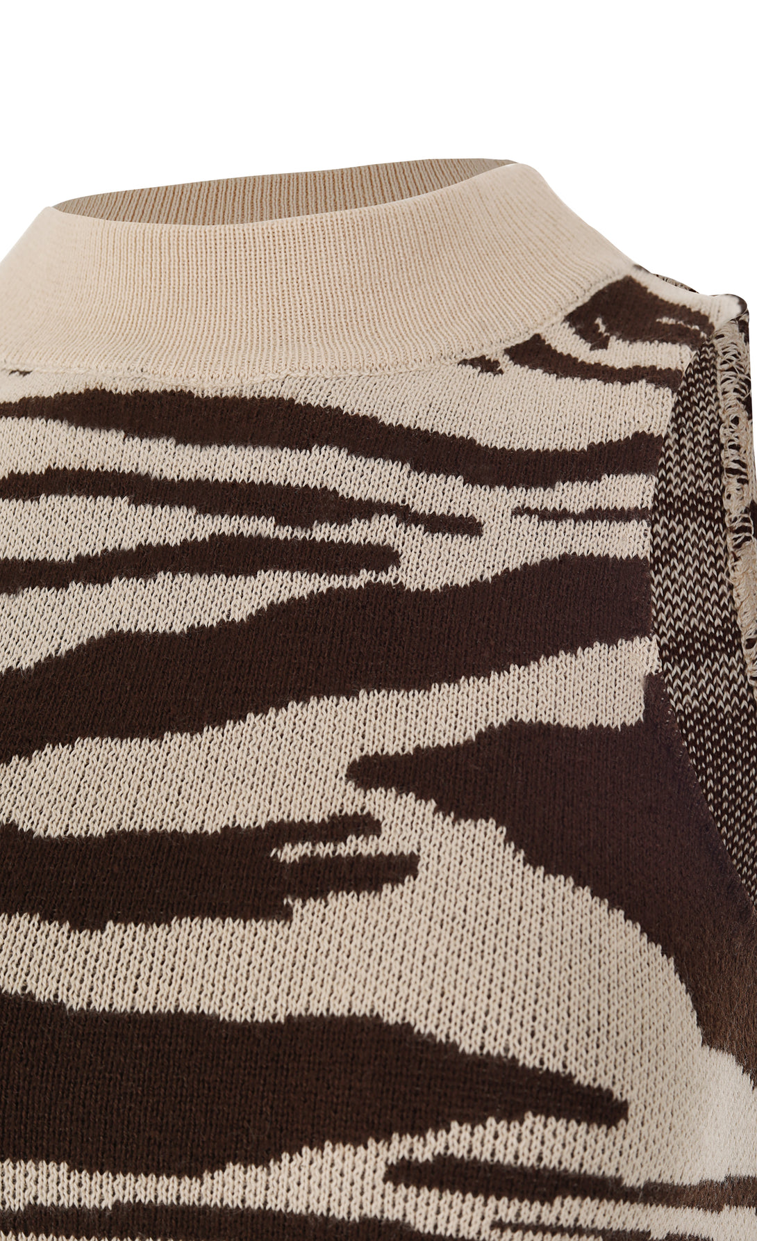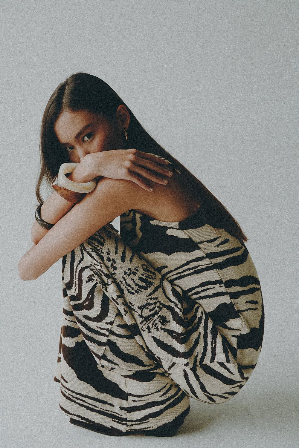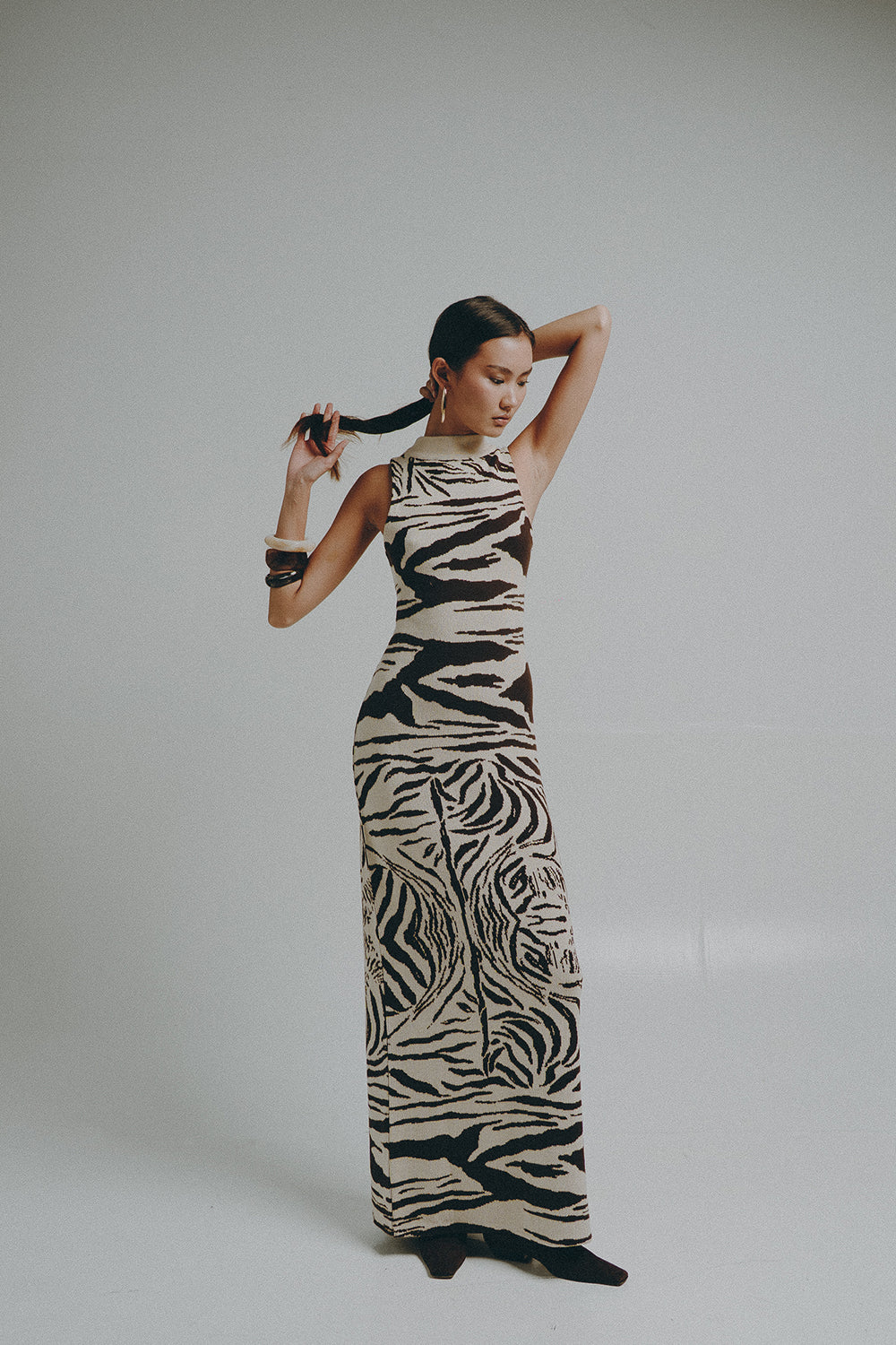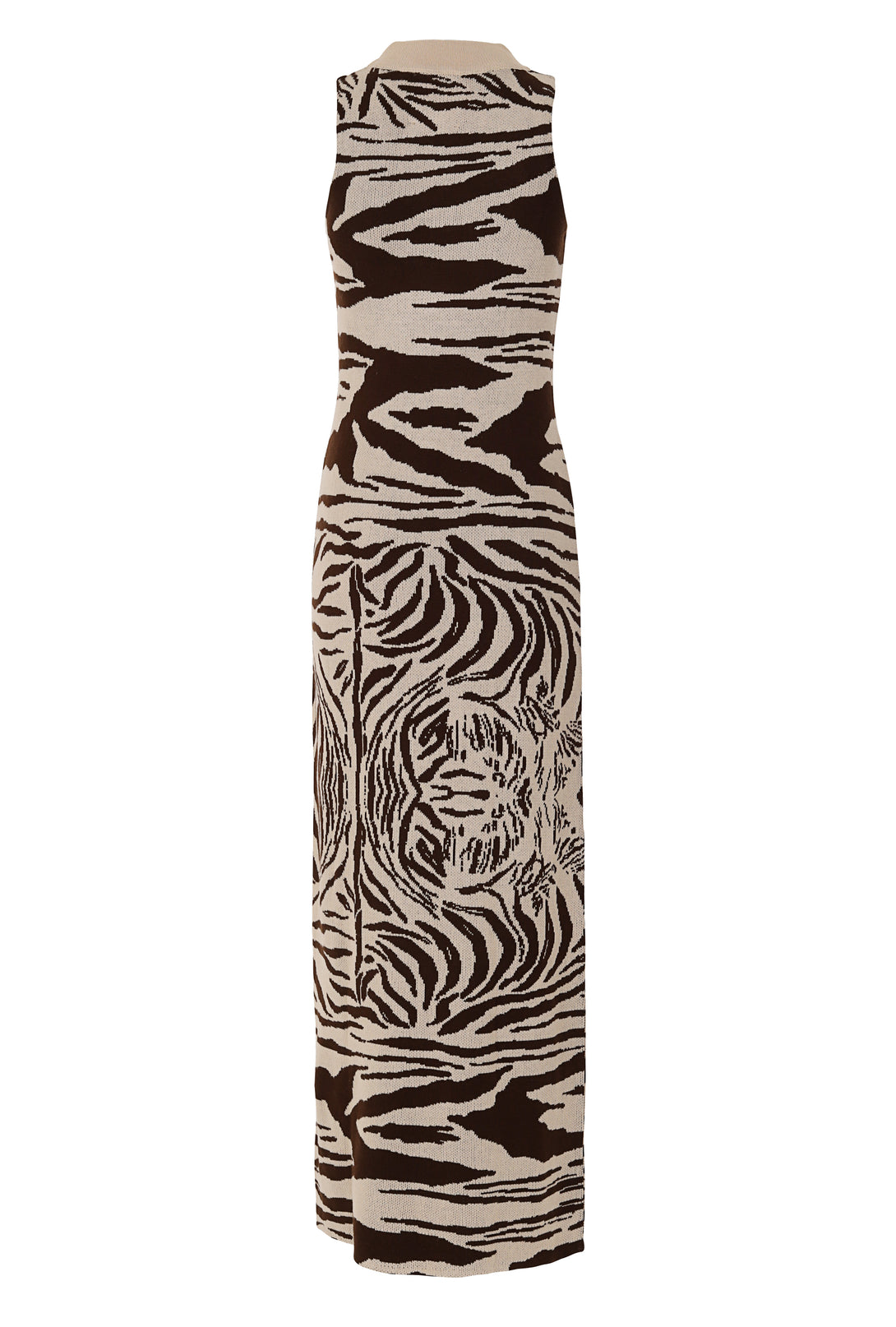 A defining piece of the collection, crafted in our exclusive Ora Ora jacquard print—designed in-house to create a truly unique, signature look. Cut in an elegant, body-skimming silhouette that flatters with quiet precision. The rib-knit neckline adds structure and refinement, balancing the fluid drape of the long skirt. A timeless statement.