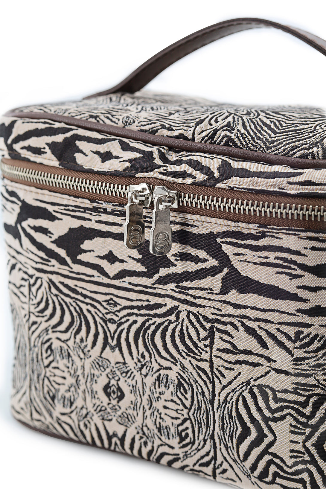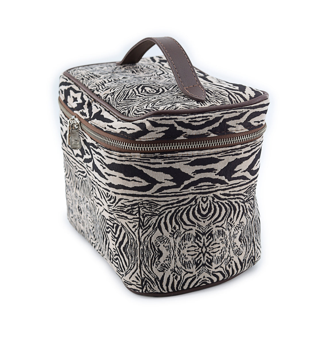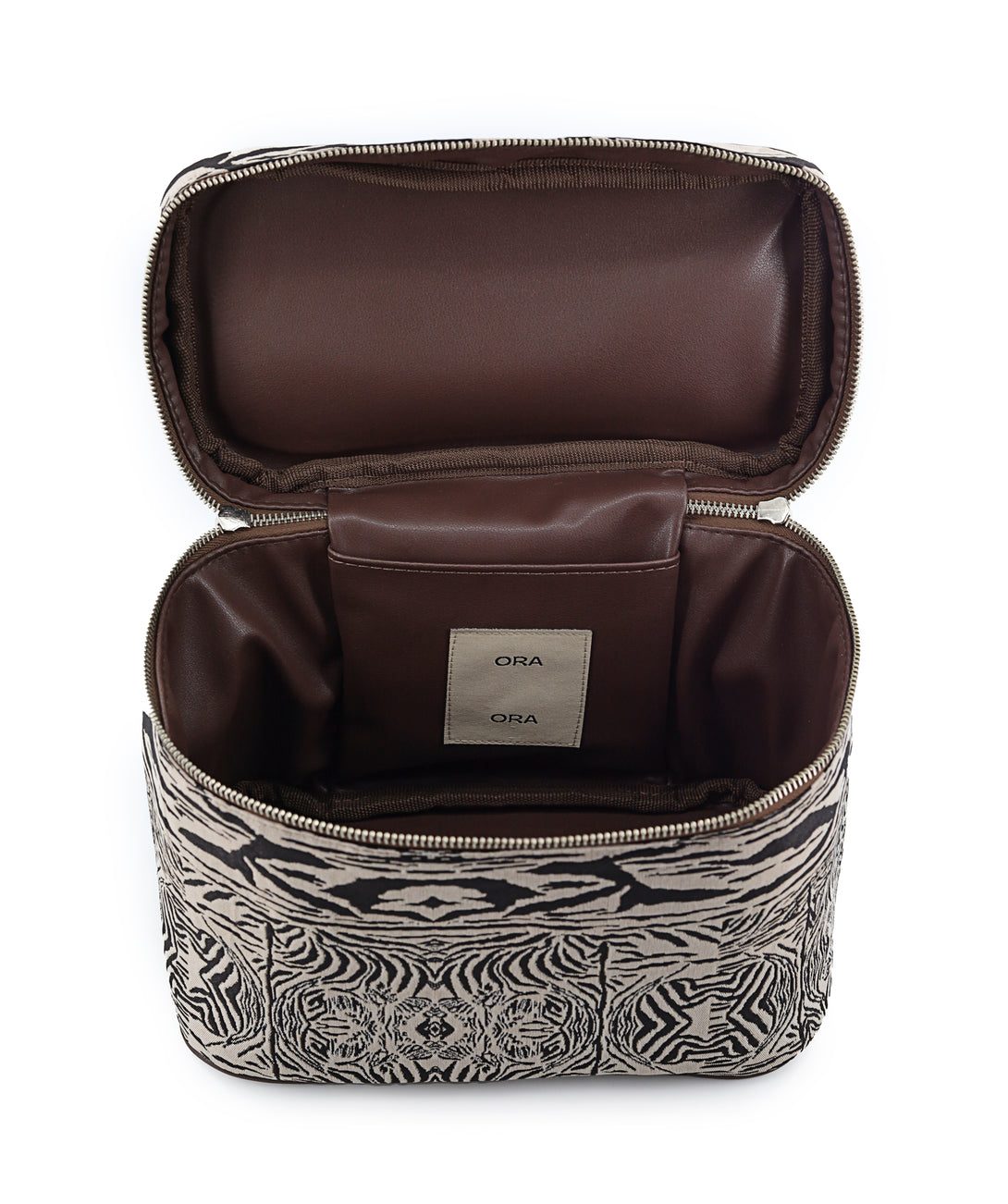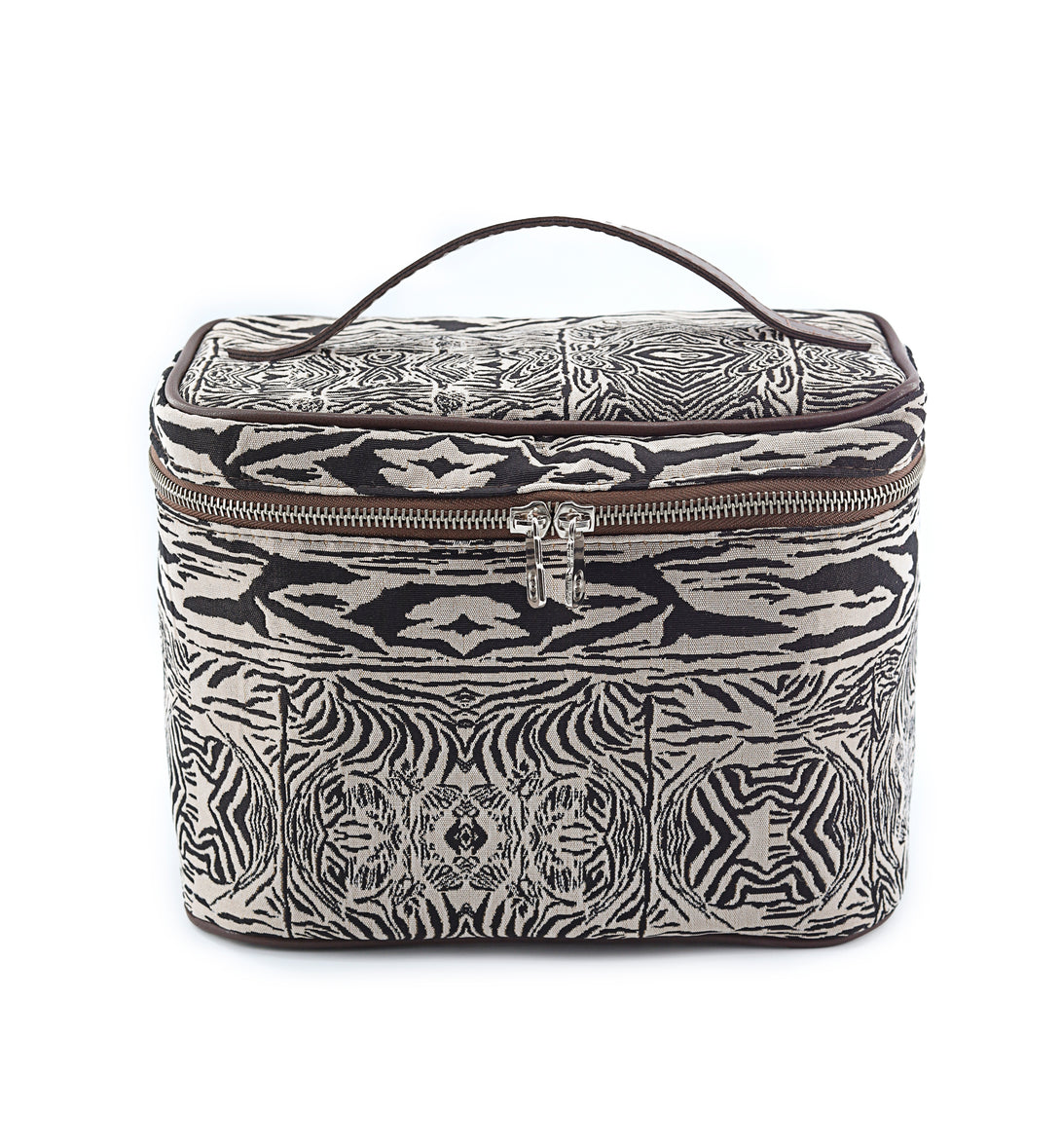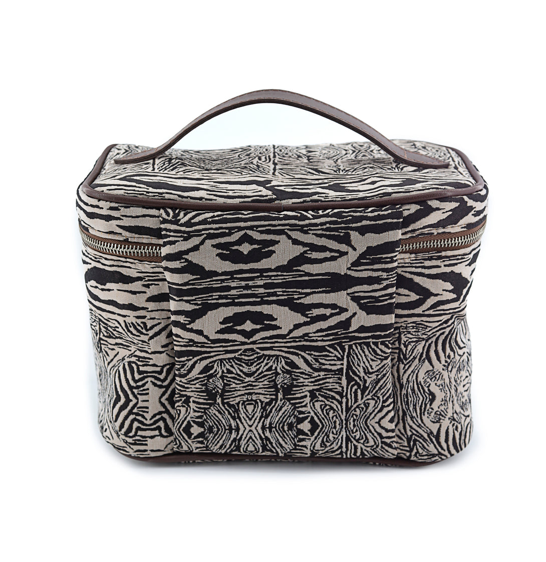 A spacious vanity case designed for elegant organization, crafted to hold your complete daily routine with ease. Its generous silhouette is wrapped in our striking woven pattern and finished with PU synthetic lining, a nickel metal zipper, a luxury puller, and reinforced poly-nylon edging for durability and elevated appeal.