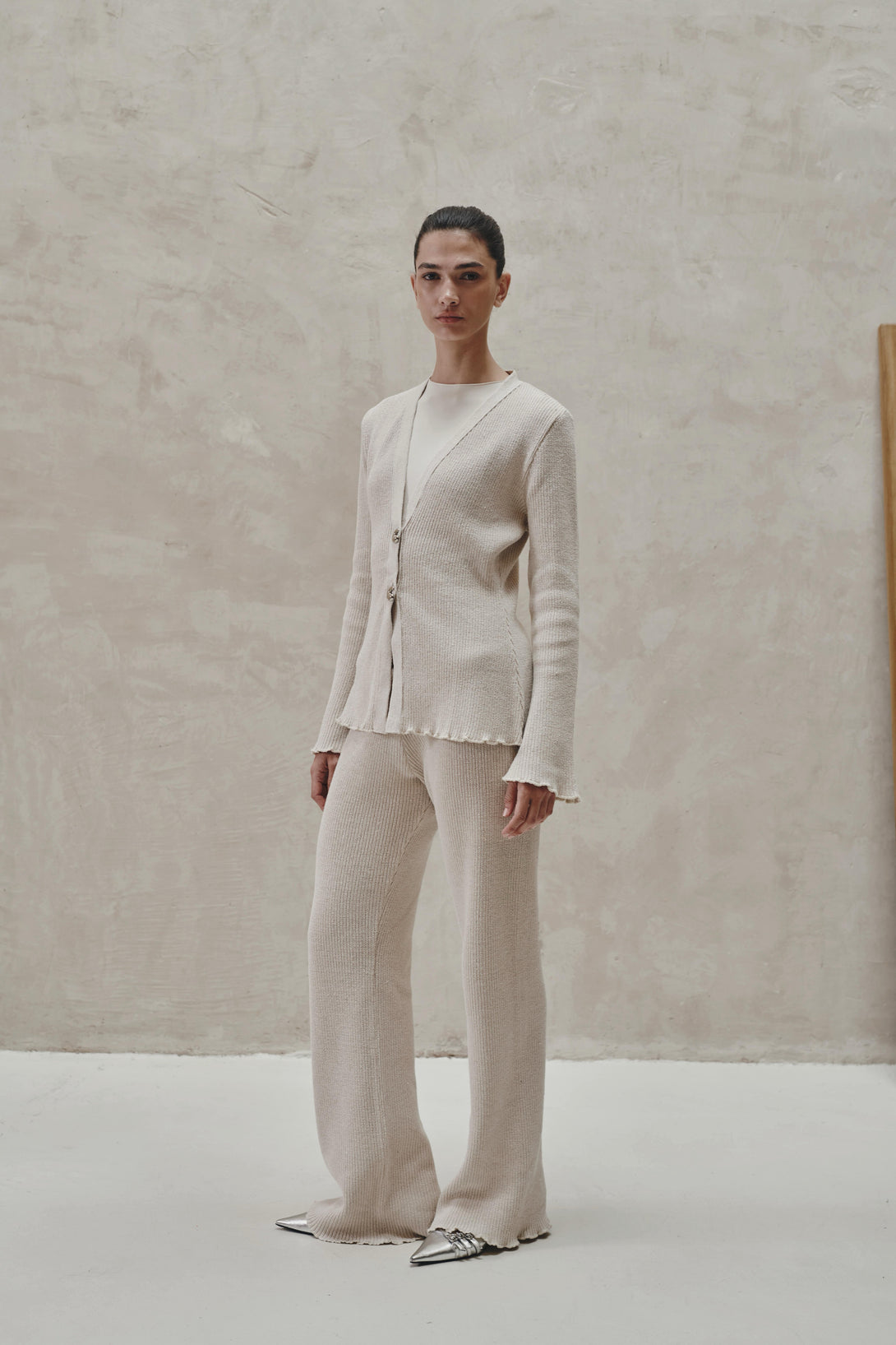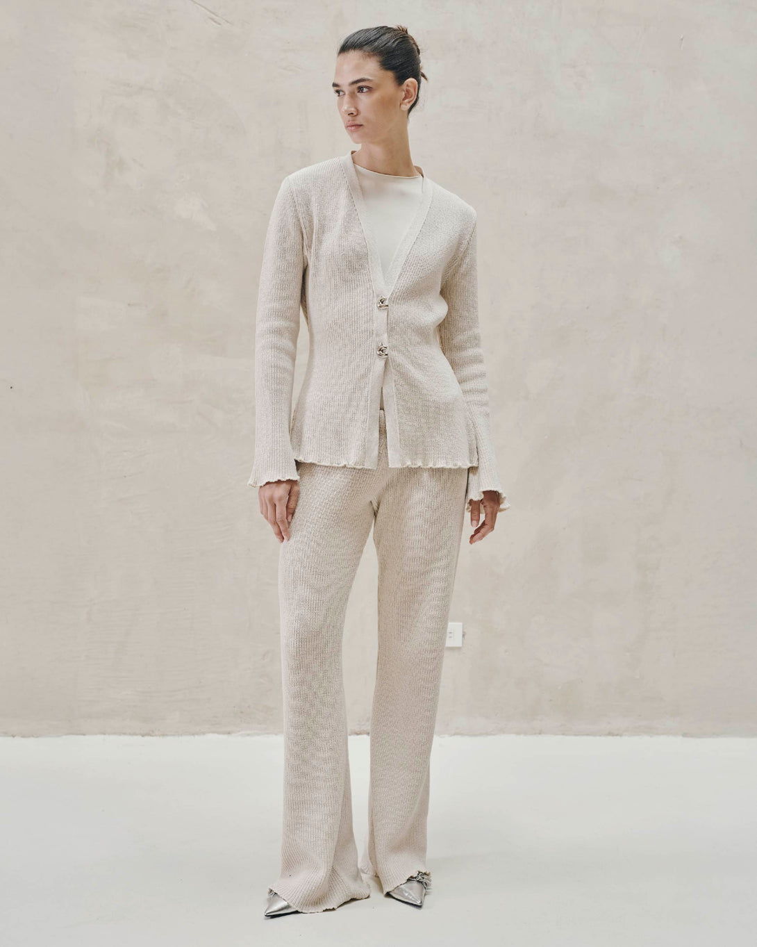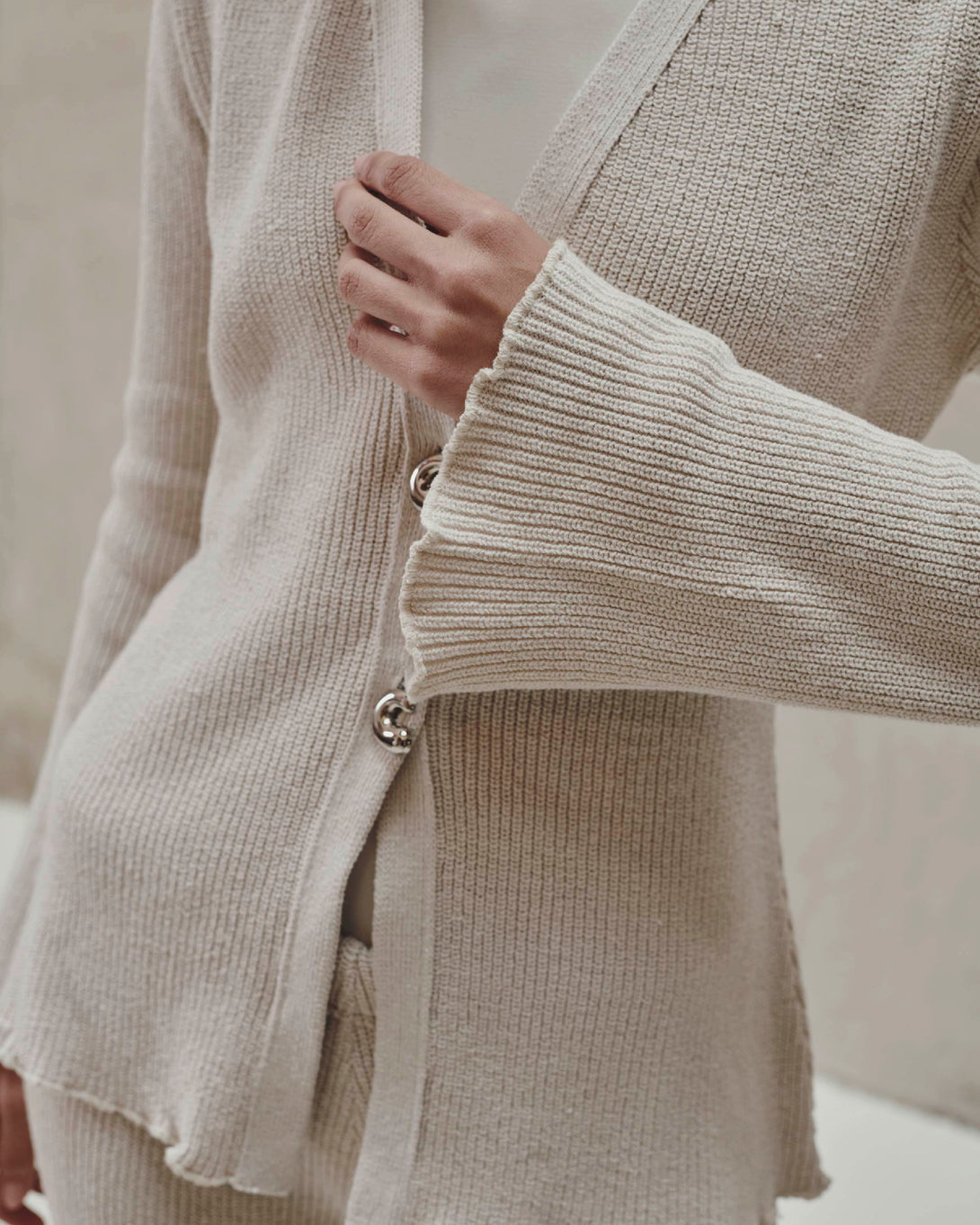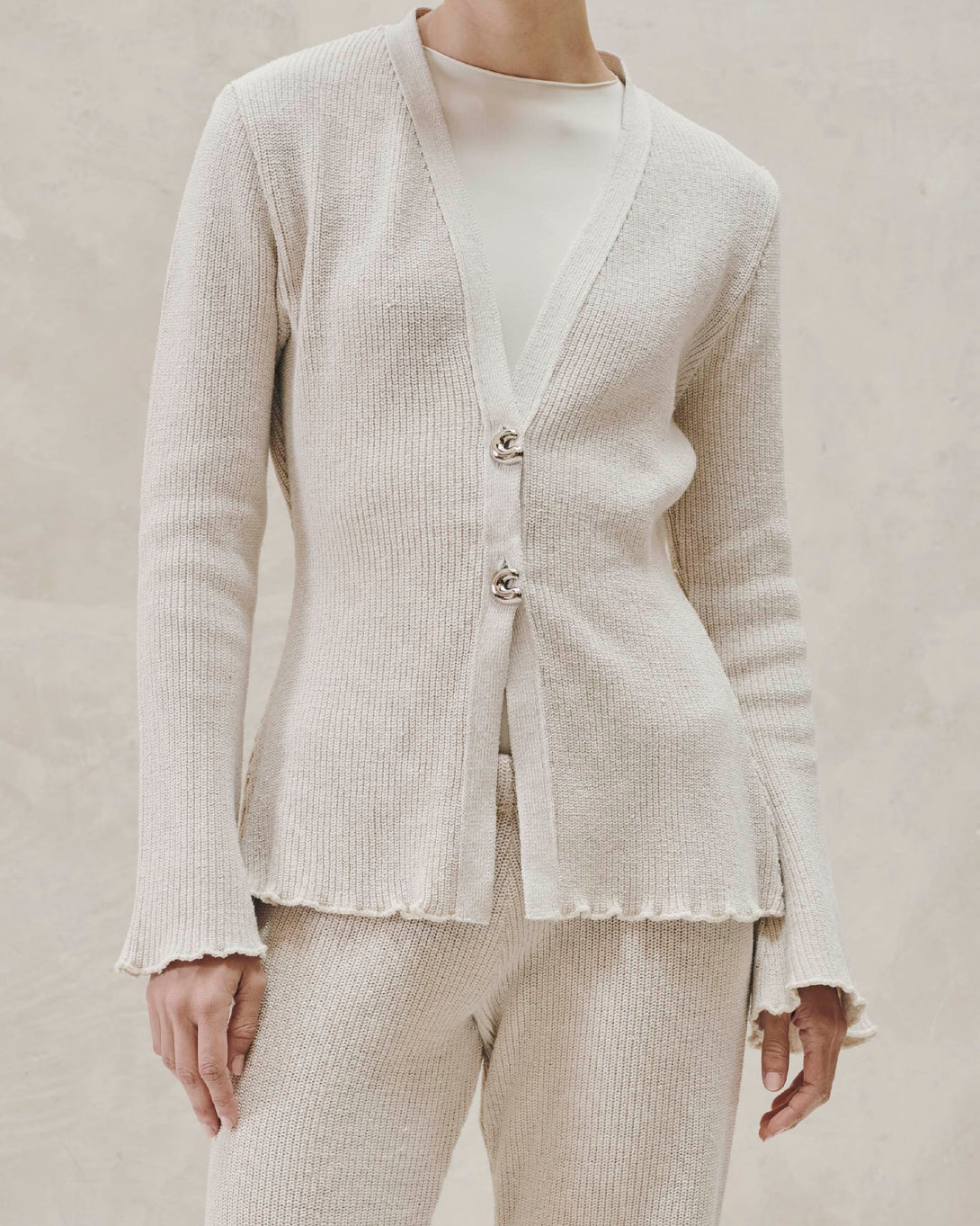Deep V-neck cardigan with matching knob and 2 jewel buttons. It has a slightly wide silhouette fitted at the waist. It has rouches-type detail on the cuffs and hem that opens the fabric to create a flared effect.