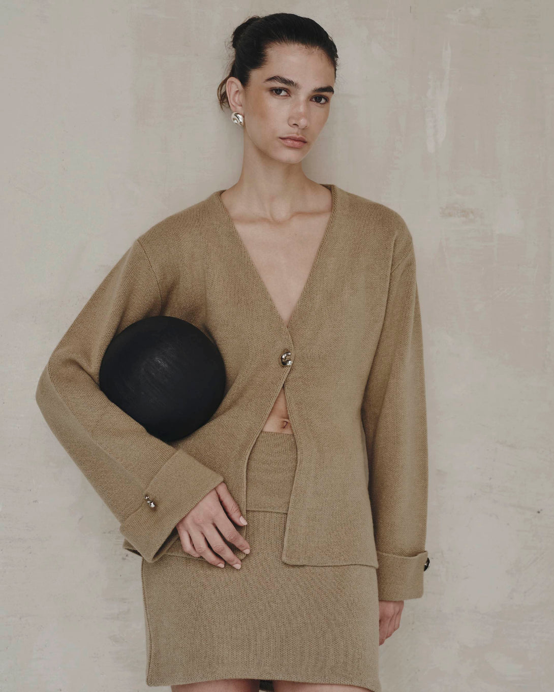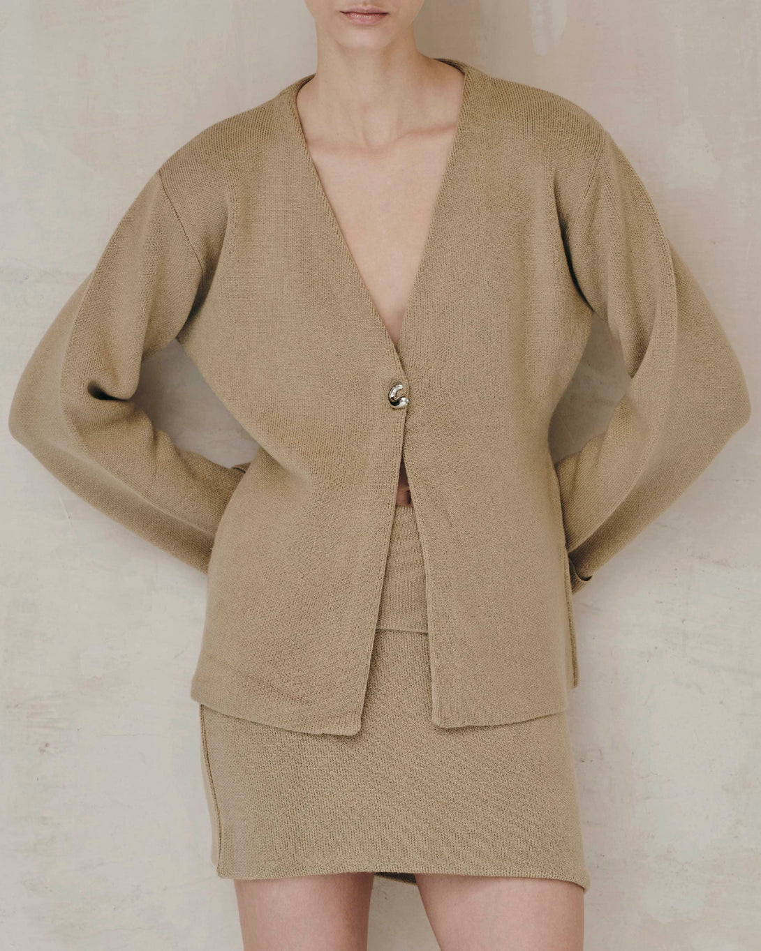 Cardigan in a full-bodied fabric, it has a military-style silhouette with a deep neckline that closes with a jewel-like button. It has folded cuffs secured with jewel buttons.