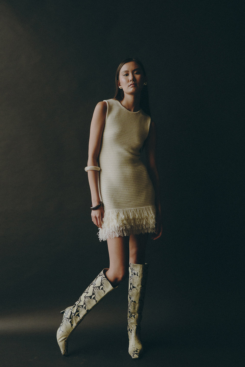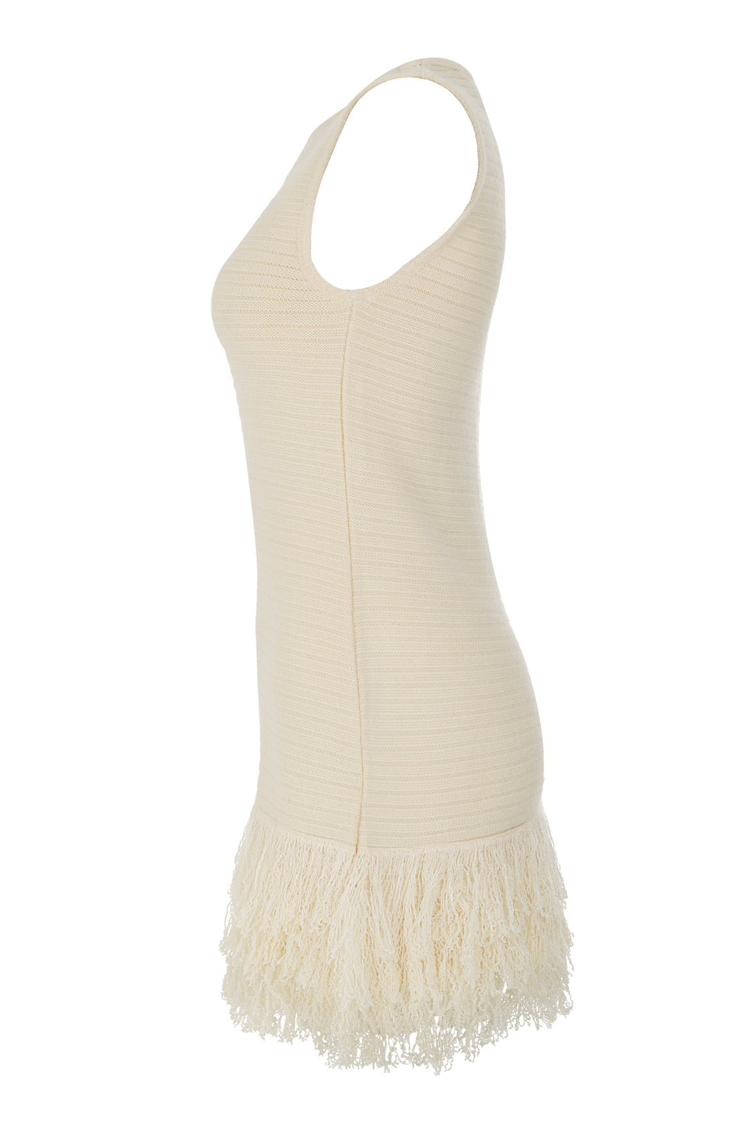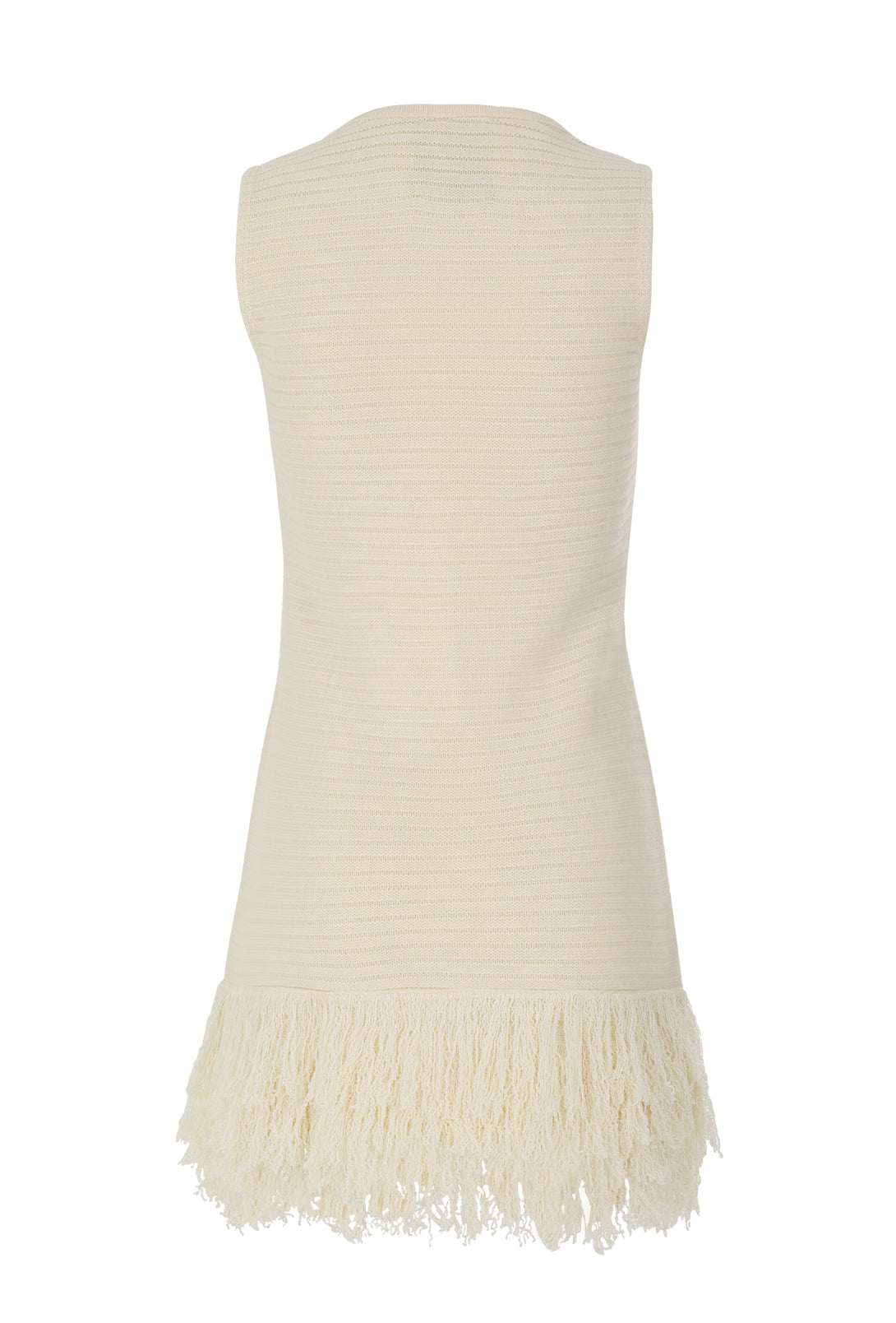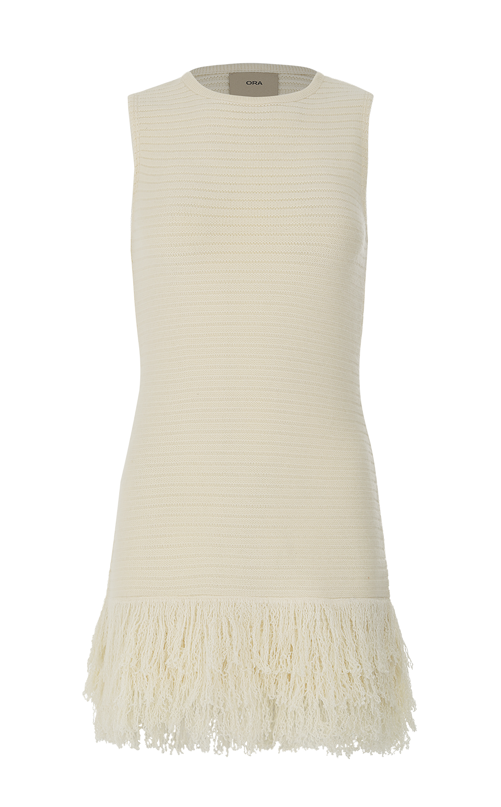 A sleeveless knit dress cut in a clean, elongating silhouette. Crafted in a soft rib texture with a hand feel reminiscent of cashmere. Finished with a tonal fringe hem that adds light movement and refined contrast.