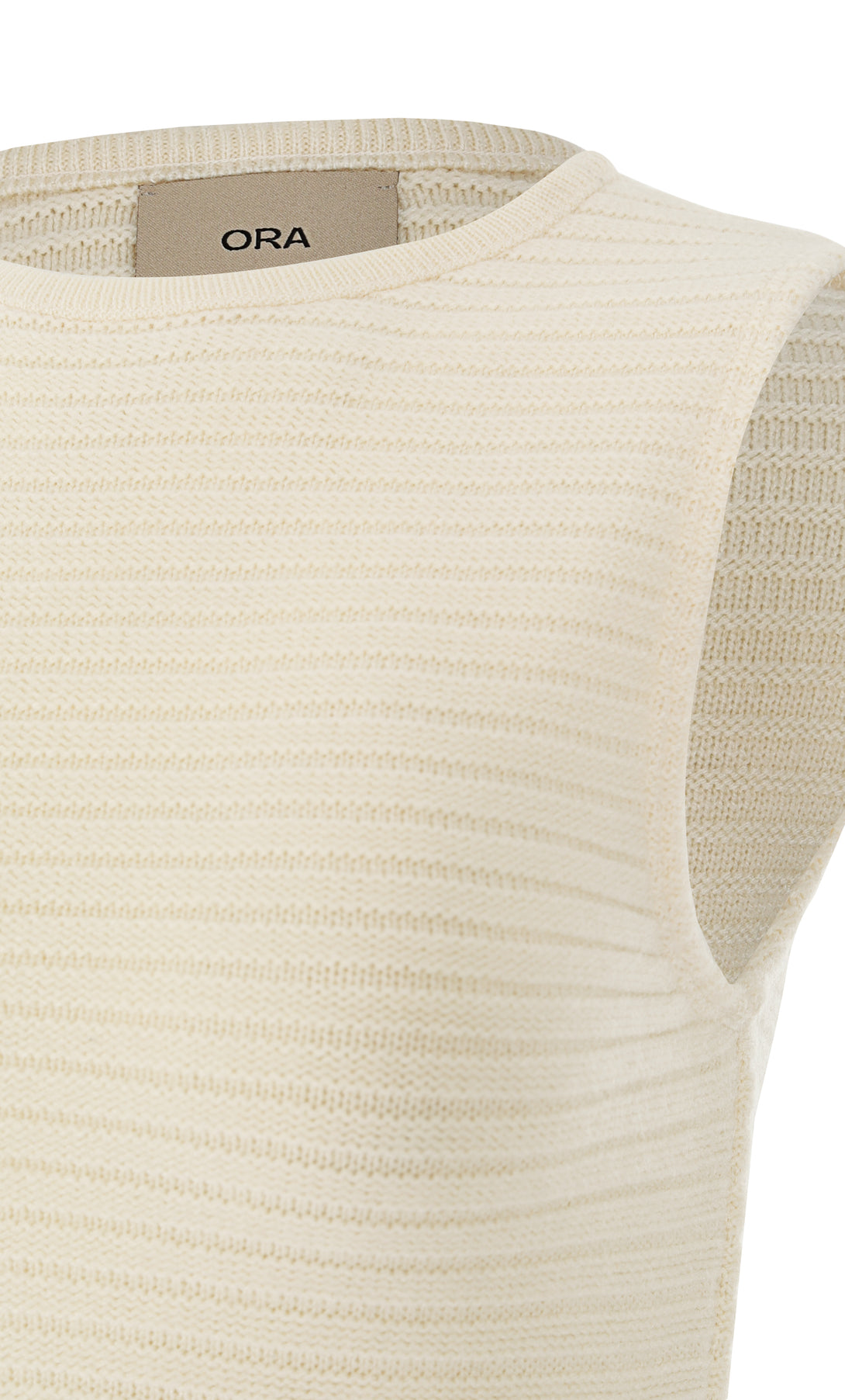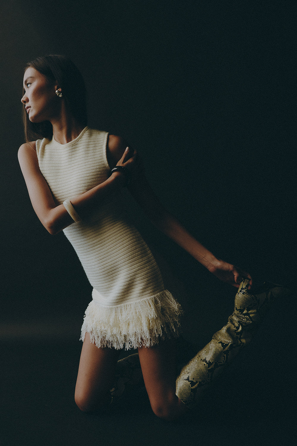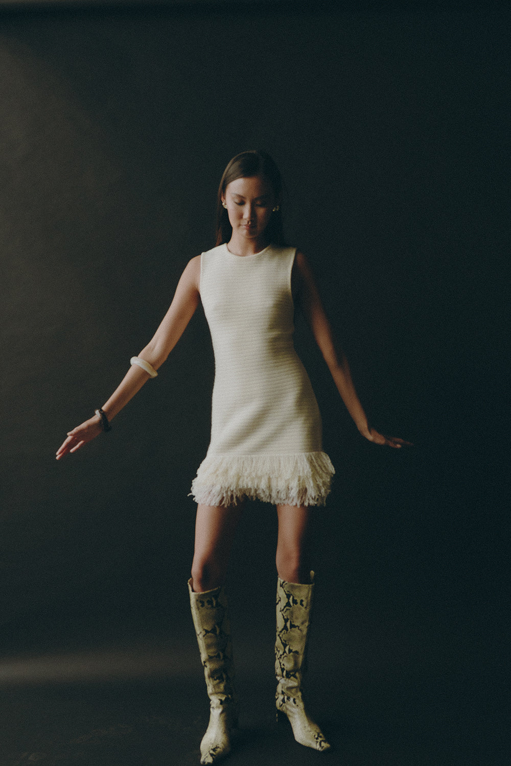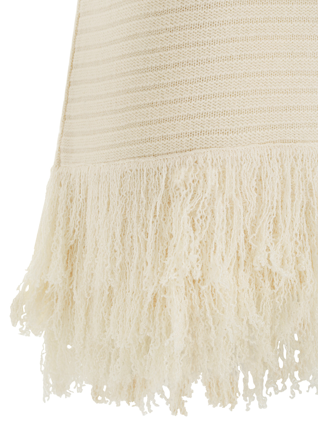 A sleeveless knit dress cut in a clean, elongating silhouette. Crafted in a soft rib texture with a hand feel reminiscent of cashmere. Finished with a tonal fringe hem that adds light movement and refined contrast.