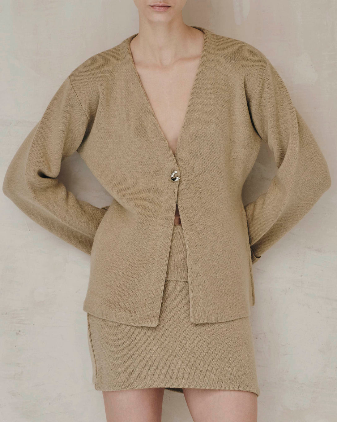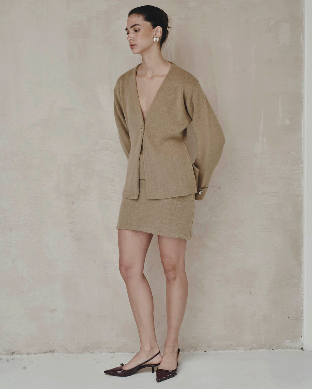 Mini skirt in fabric with a lot of body to match with beige cardigan A, it has a fold at the waist with hidden elastic for a better fit.