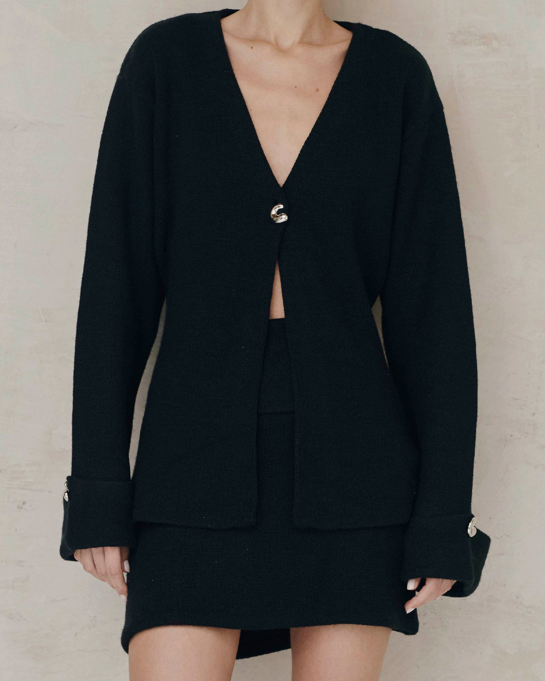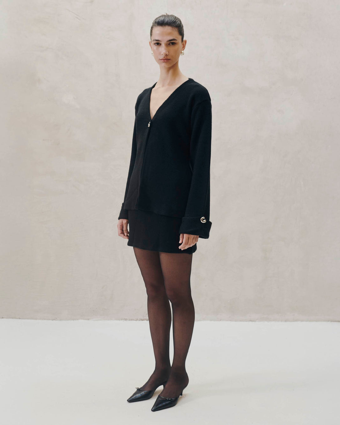 Mini skirt in fabric with a lot of body to match with black cardigan A, it has a fold at the waist with hidden elastic for a better fit.