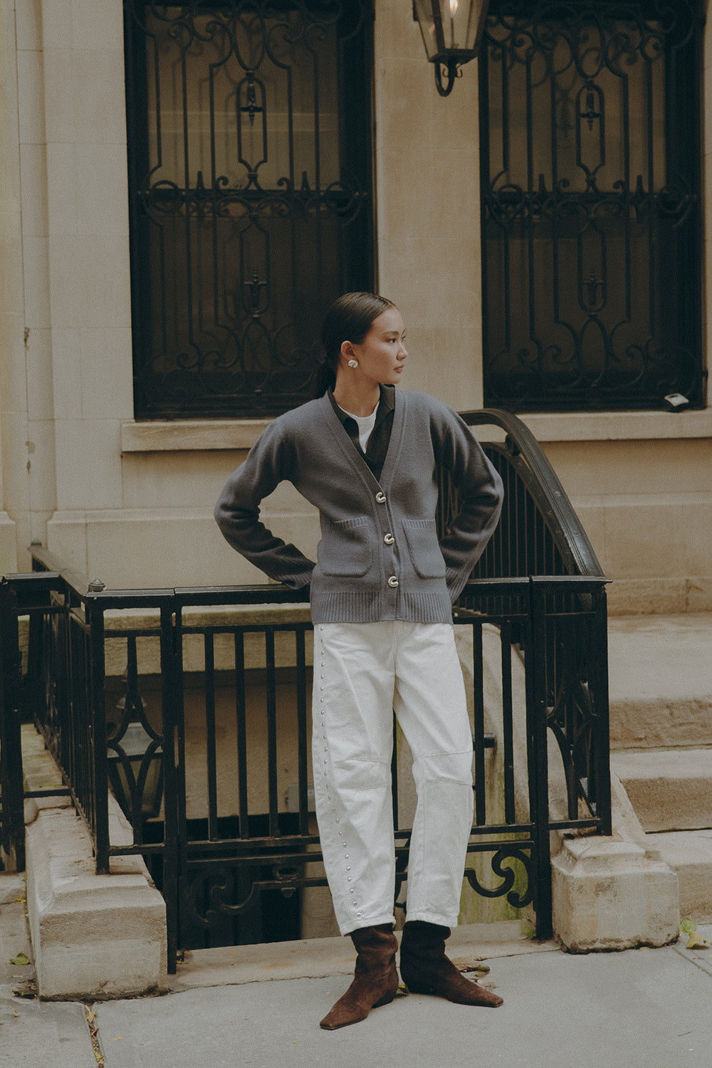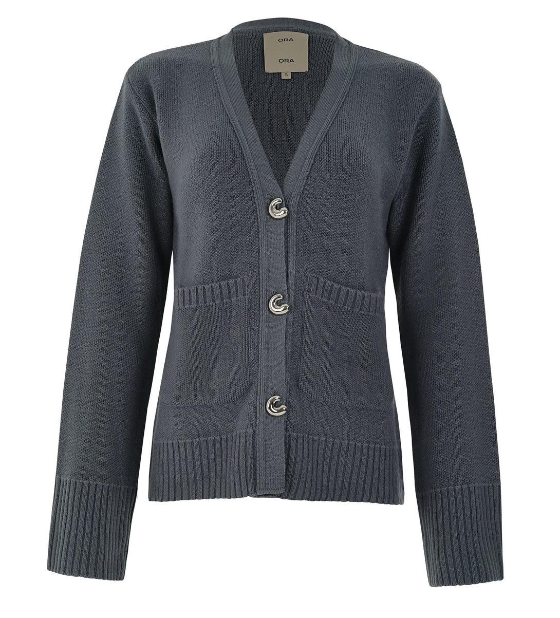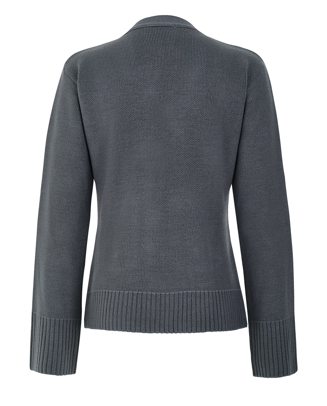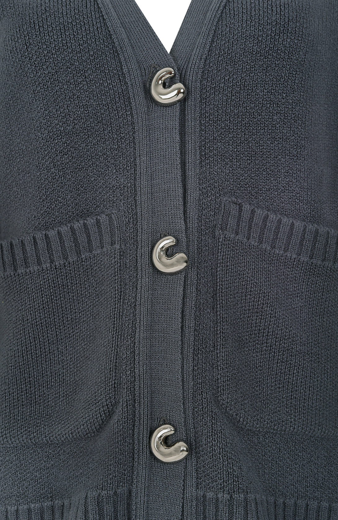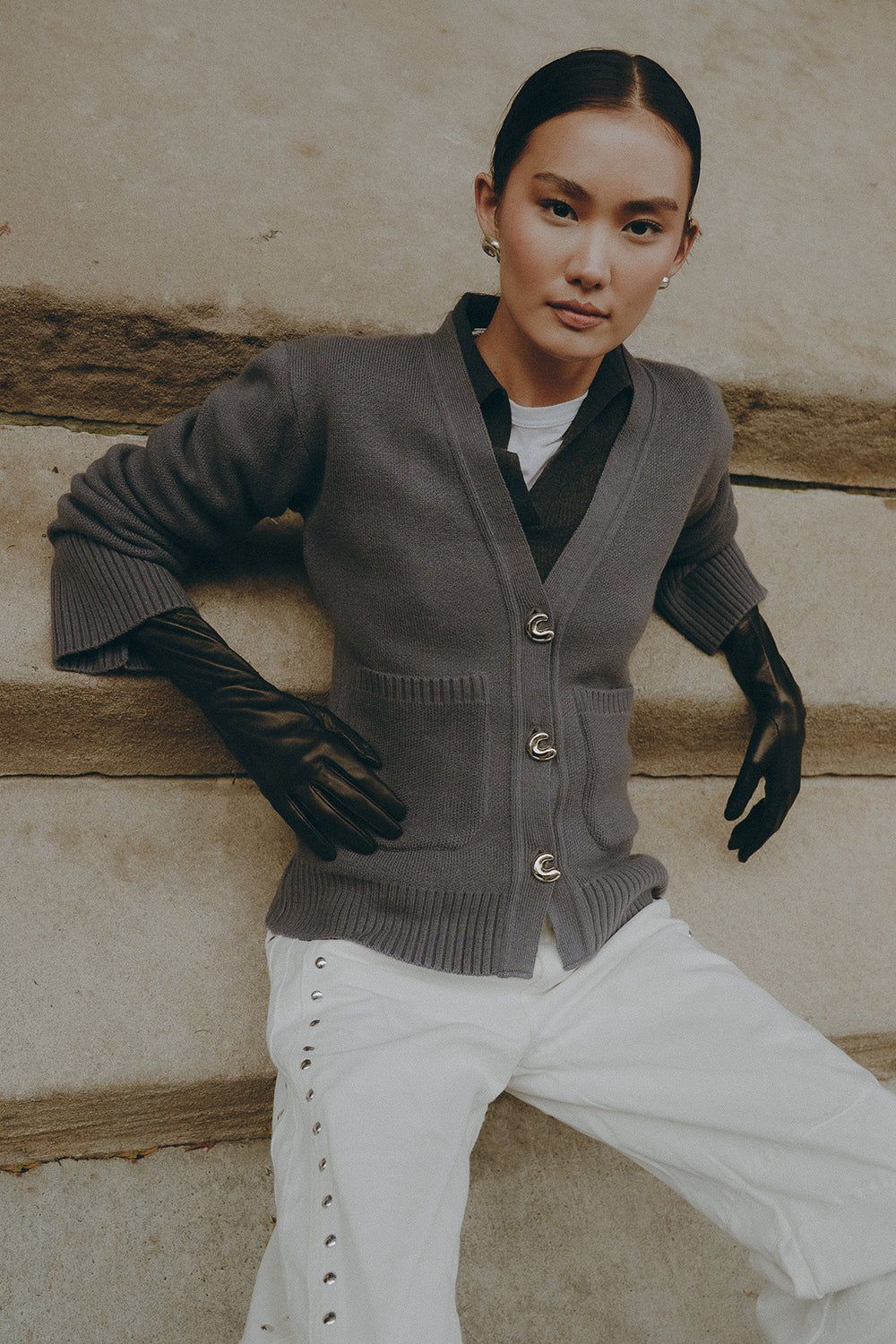A classic rib-knit cardigan elevated by our signature trio of statement buttons. Designed with a universally flattering fit that drapes beautifully on different body types. Front patch pockets add timeless ease, while the wide ribbed cuffs give the sleeves a relaxed, modern silhouette. A polished essential that blends heritage and contemporary style.